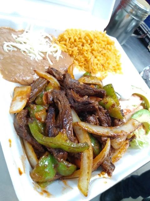 Chicken strips grilled with green pepper and onions garnish with tomato and lemon wedges. Amigos Mexican Restaurant is located in Will County of Illinois state.